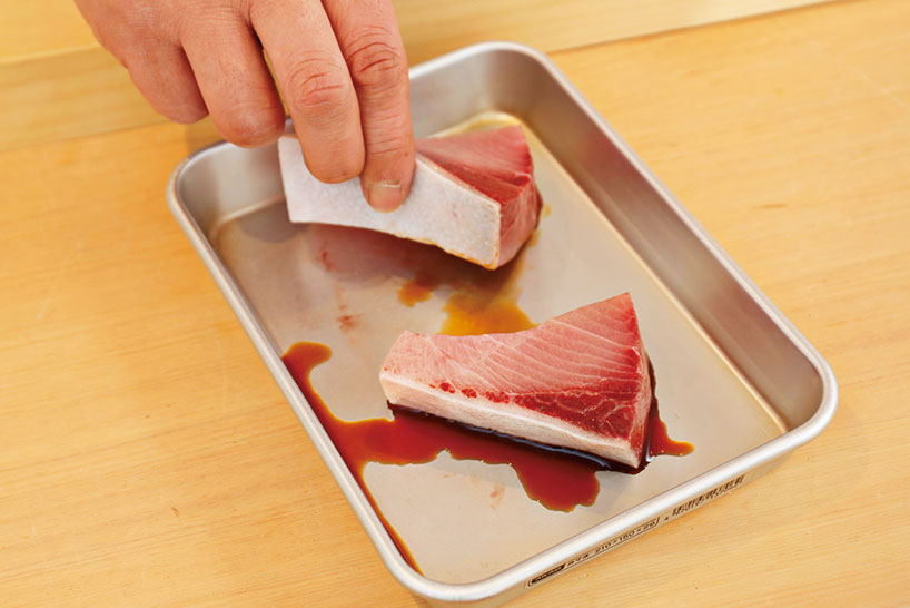 切り出したブリの切り身の両面に塩をまぶし10分ほど寝かせ、浮き上がった水分を拭き取り、少量の濃口醤油に浸しさらに10分置く。