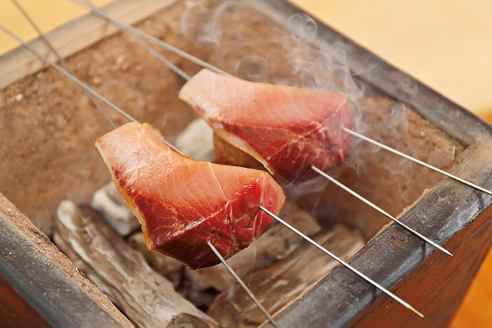 橋本氏にとって魚を焼く際には、金串は大切な道具。熱伝導により、身の内側まで熱が通りやすいのも重要なポイントとなっている。