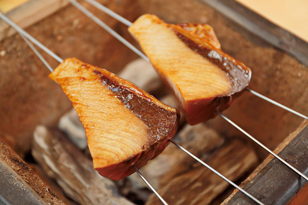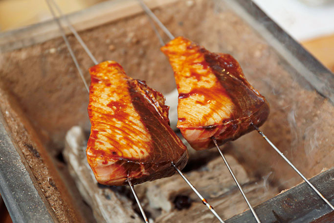 醤油ベースのタレを付けることで焦げやすくなるため細心の注意を払う。両面を焼いた切り身には、熱が通っているためタレを乾かす程度に。