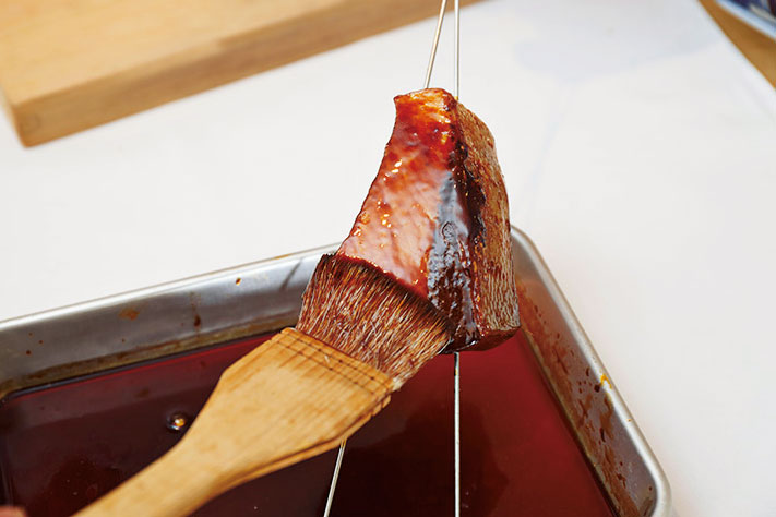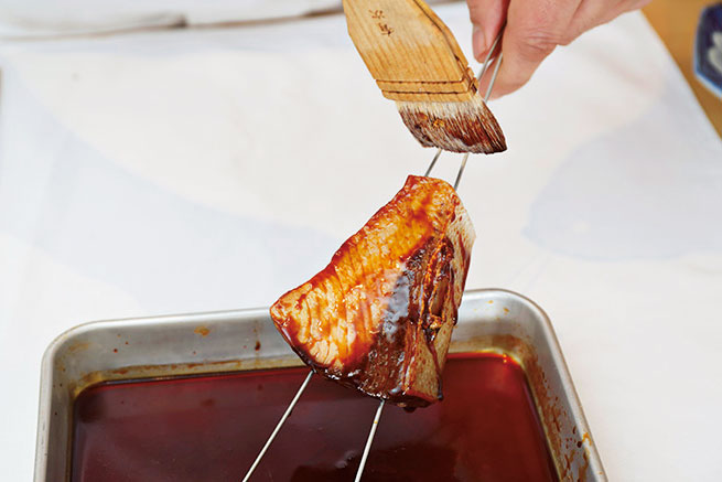 表面と同様に焼けているのを確認したら、仕上がりまでに合計三度のタレを刷毛で塗り付けるが、その初回。すべての面を丁寧に。