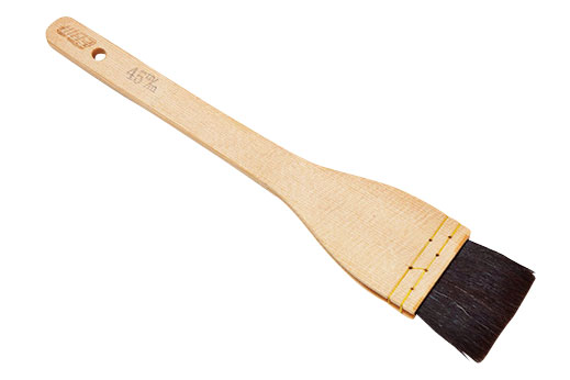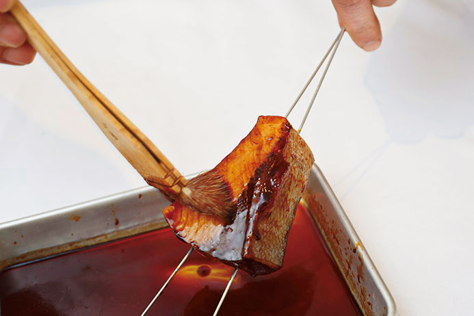 切り身に醤油タレを三度付け、照り焼きをアシストするのが料理用の刷毛。長く使い慣れた刷毛は繊細な日本料理にとって使用頻度も高い。