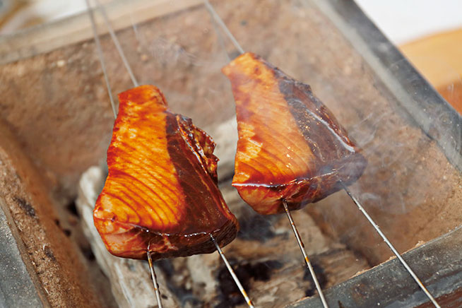 炭から放出される熱が一定になり安定を知らせる白炭が浮いていることを確認し、串刺しした切り身を表面となる側から炭にかける。