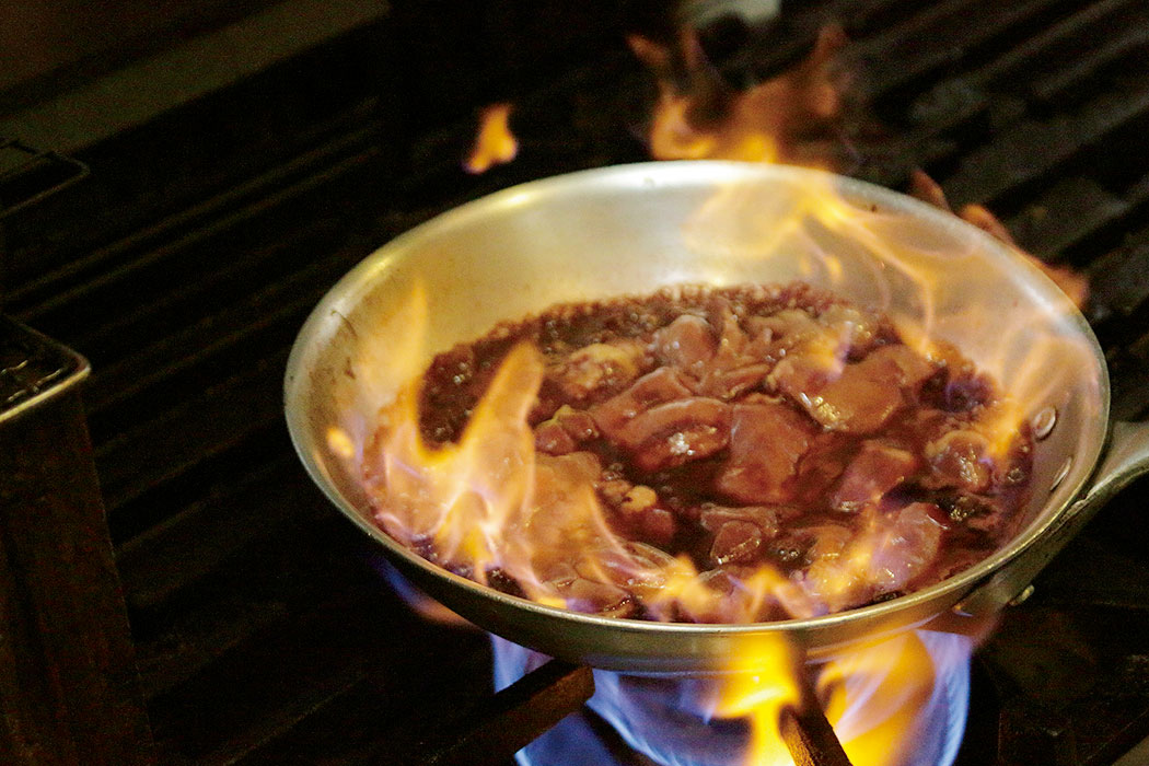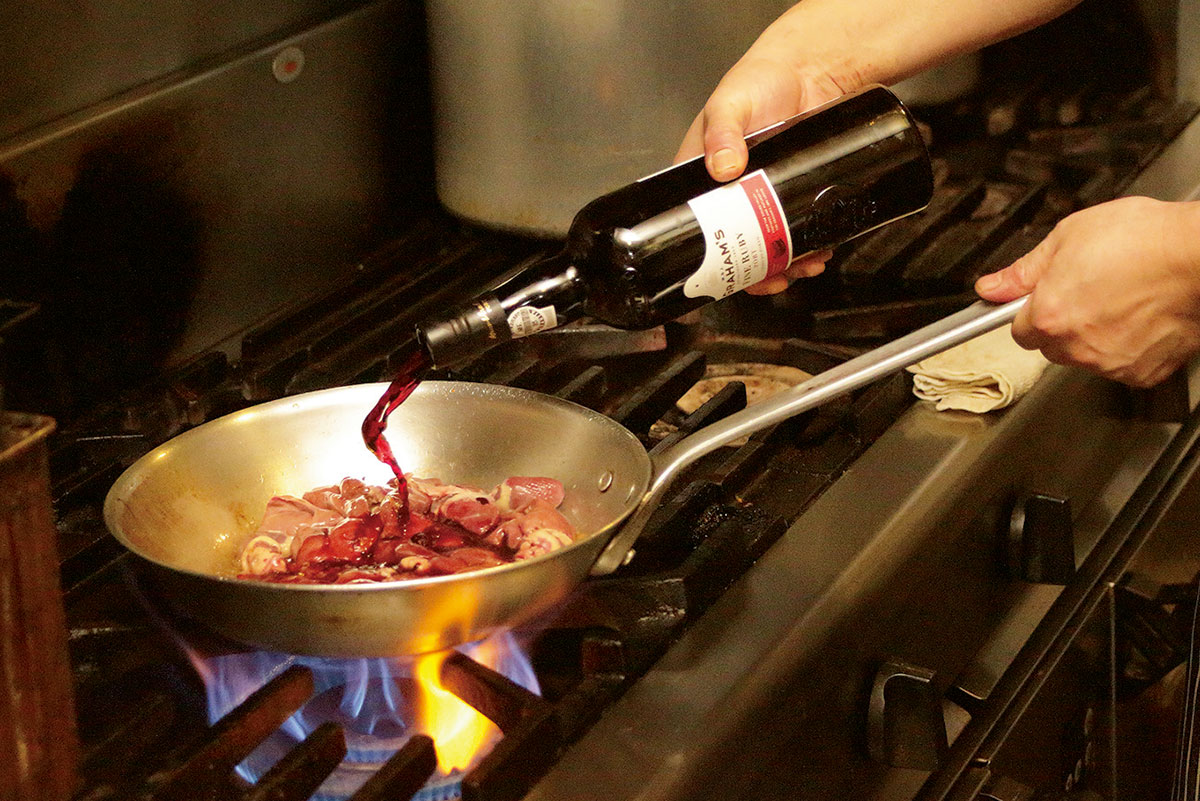 2 適当な大きさに切り分けたレバーを加え、そこへポートワインを注ぐ。