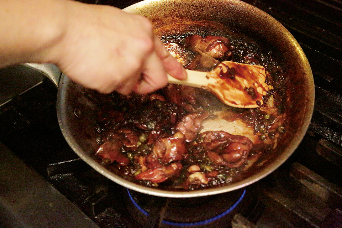 4 グツグツと煮立ってきたところへ、ケッパーとカソナードを加える。