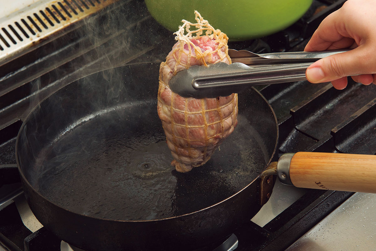 5 トングでブロック肉を持ち上げ、焼けていない肉の端の部分をフライパンに当てて焼き目をつける。すべての面に焼き目がつくように、トングを上手に使いながらブロック肉の形に合わせて焼いていく。