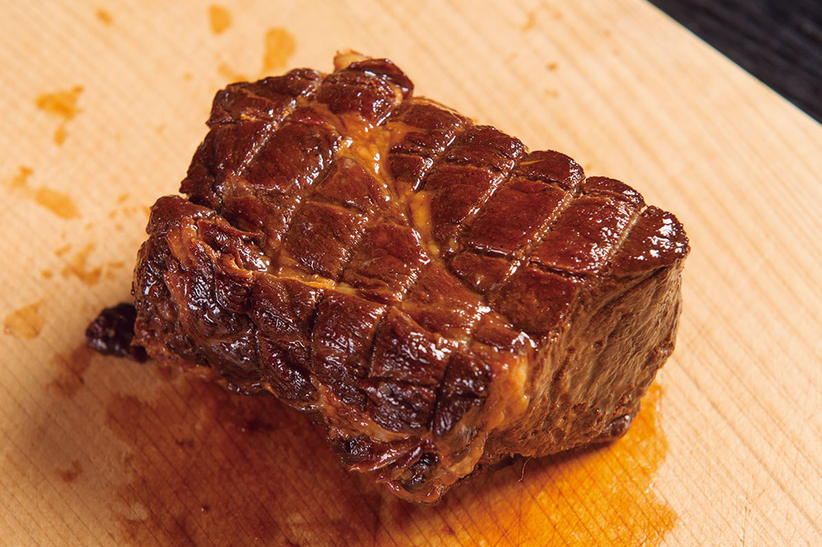 2 ある程度までタコ糸を切ったら手に取って肉から糸をはがしていく。タレの色とタコ糸の跡がきれいで美味しそうなブロック肉。これが完成形だ。