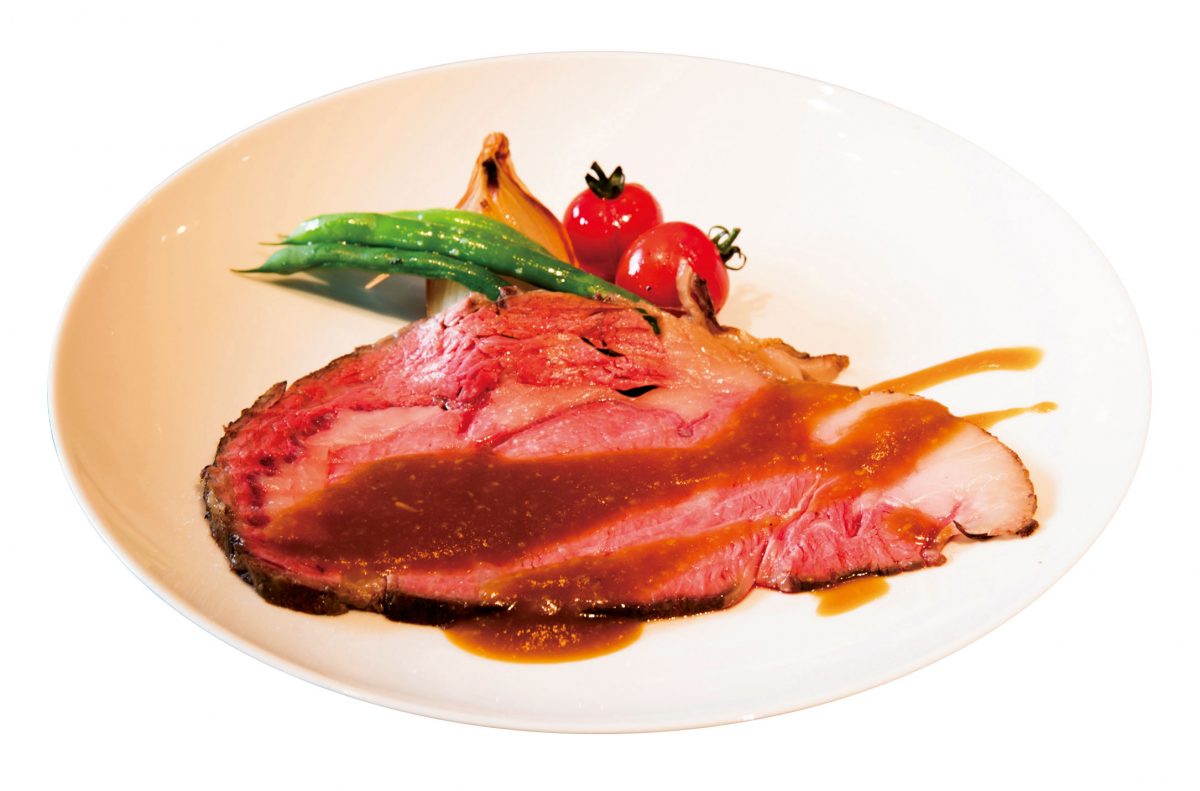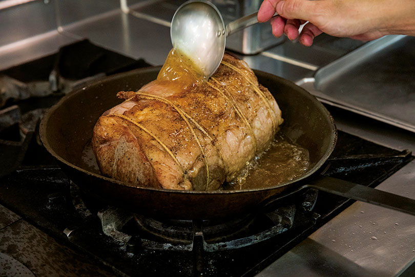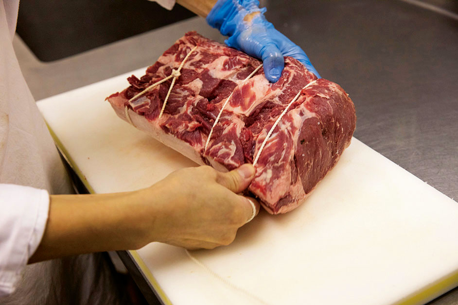 店で提供されるローストビーフは、薄切りながら、整った楕円形をしている。塊肉は火を通すと、形が崩れてしまうものだが、タコ糸で縛ることでローストビーフ特有の形状が保たれる。視覚的な美味しさを生み出すテクニックだ。