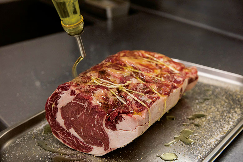 タコ糸で縛った肉は、全面に塩・コショウを振り、オリーブオイルを塗ったうえで一晩寝かせる。この工程により、下味が定着し、肉からアミノ酸が発生し旨味が増すという。塊肉から作るローストビーフならではの玄人技である。