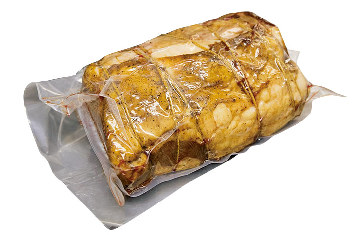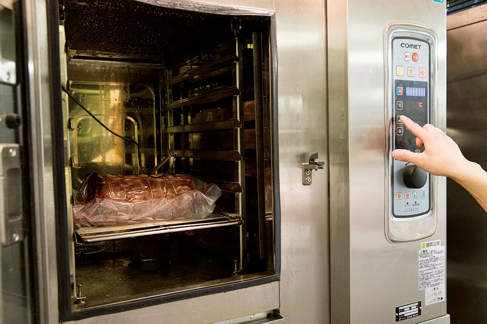 焼いた肉を真空パックし、芯温が58°Cになるよう5時間かけてスチームコンベクションオーブンにかけるのがプロの技。自宅であればストックバッグに肉を入れ、ストローで空気を抜き、75°Cの湯煎で芯温58°Cを目指せば良い。