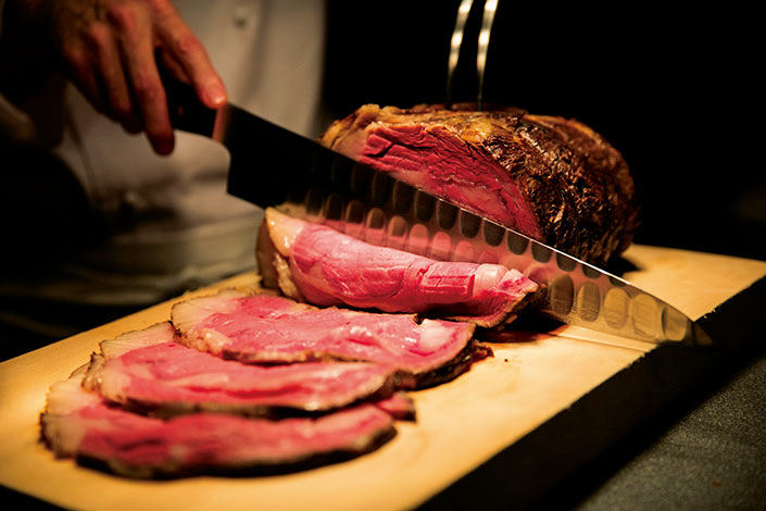 「ローストビーフは火加減、味付けも重要だが、なんといってもあの薄さと食感が重要。特に断面を滑らかに仕上げるためには、刃渡りの長い牛刀が適しています。刃に凹凸がついたタイプならば、自然と肉が刃から離れるため、切りやすいのです」