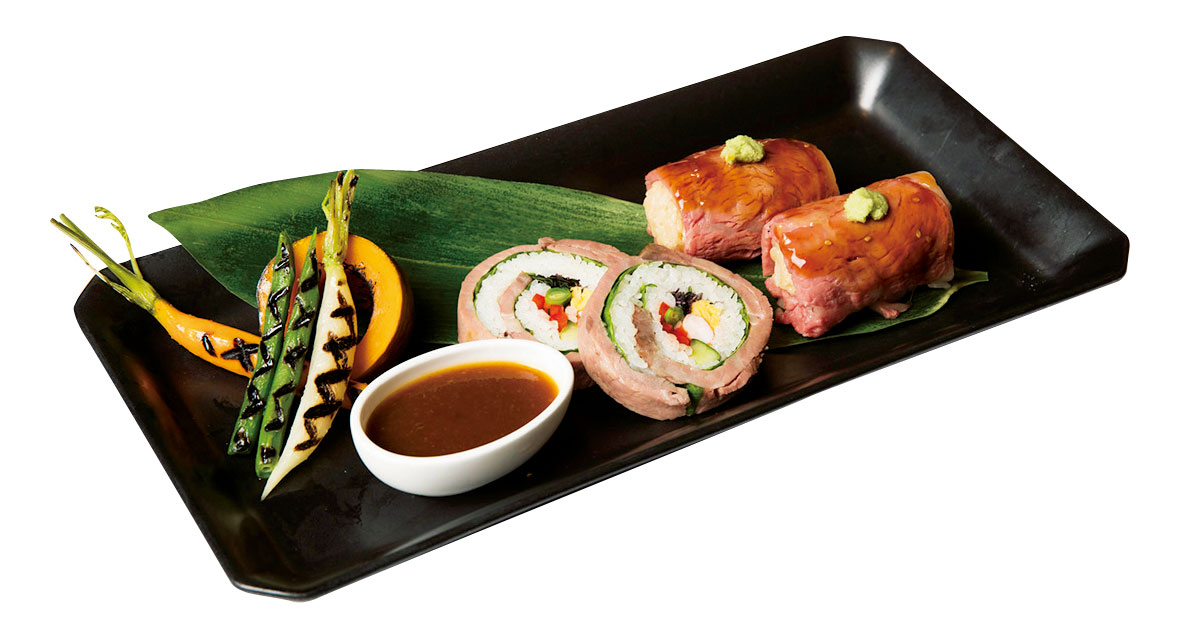最後に、ローストビーフを使用した料理長直伝のサプライズメニューを紹介しよう。ロール寿司(写真中央)は具材を入れて巻くだけ、握り(写真右)は白飯にタレを混ぜて俵型に握りローストビーフで包み、わさびをのせるだけだ。自家製ローストビーフを楽しんだあとの〆に、こんな一皿が出たら歓声が上がることは間違いない。