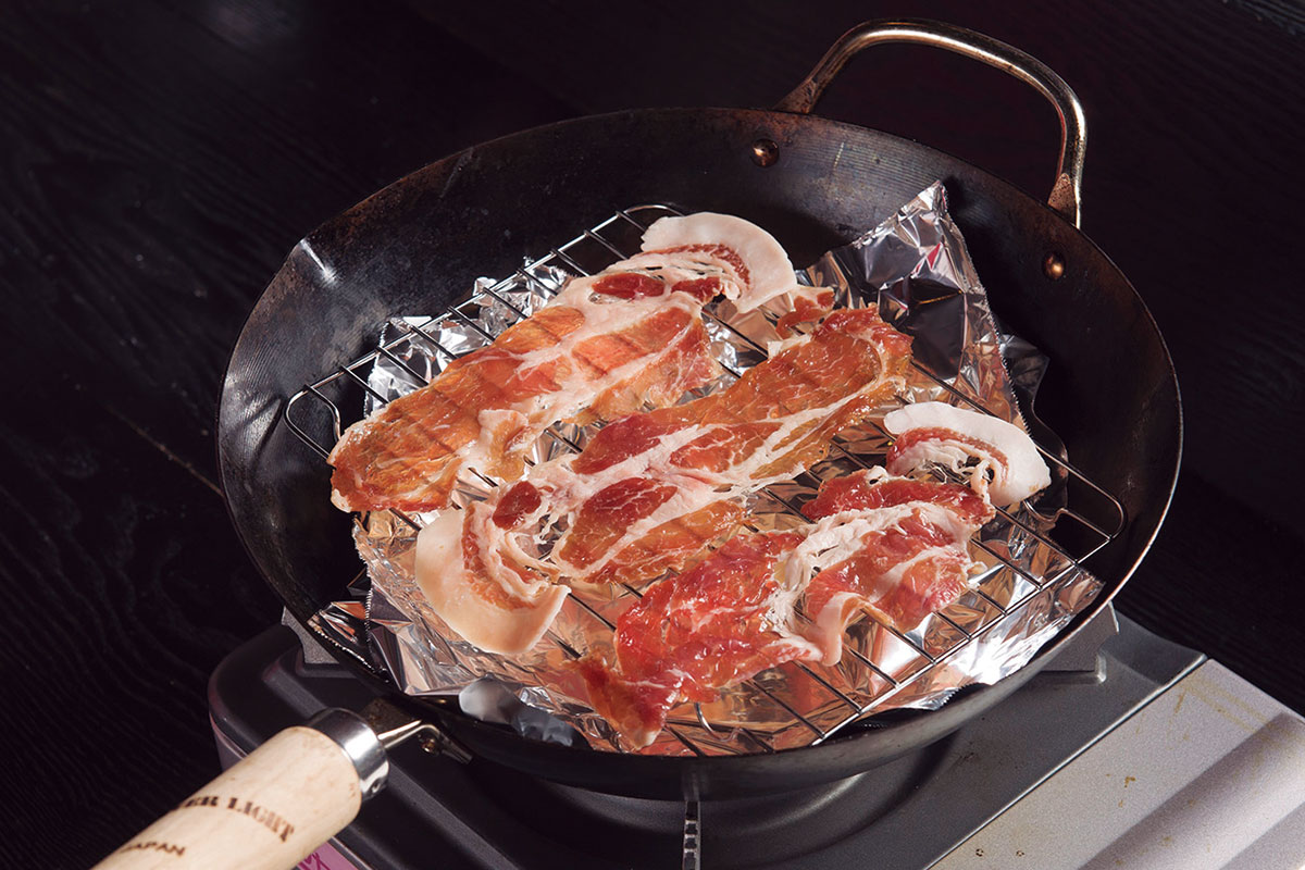 7 冷蔵庫で脱水シートに包んで乾燥させておいた肉を1枚ずつ丁寧にはがして、中華鍋の網の上に並べていく。