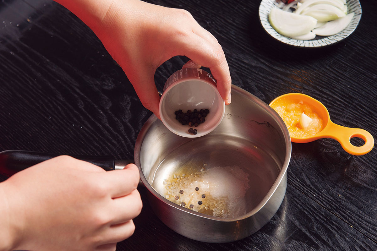 3 黒こしょうを加える。ソミュール液に入れるスパイスの代表として、定番のスパイスだ。