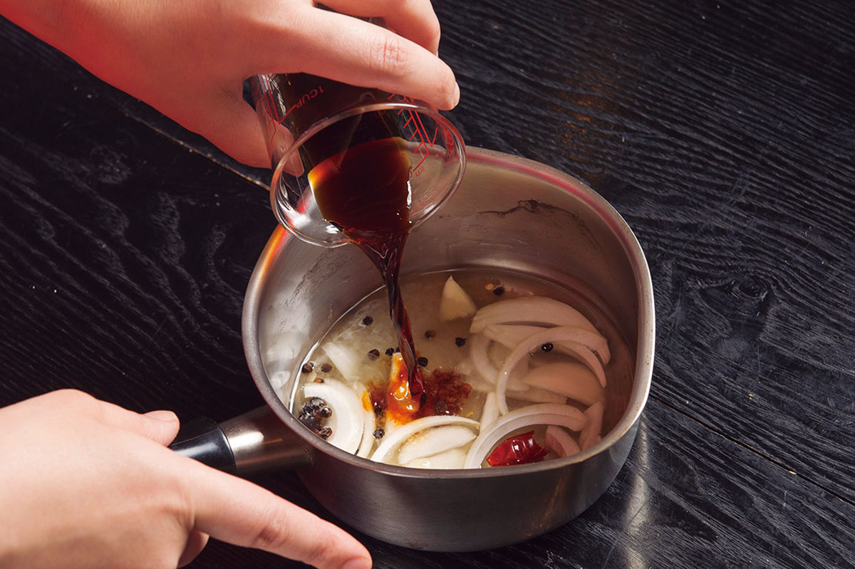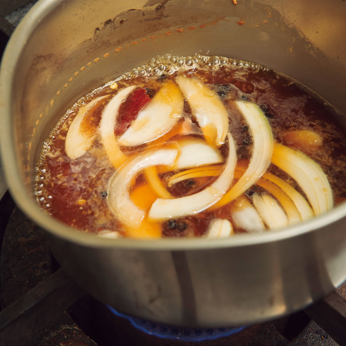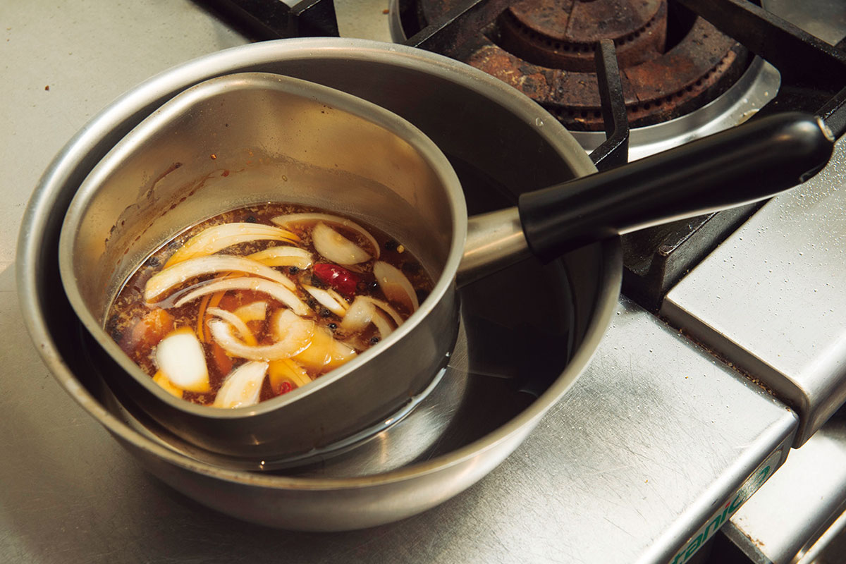 6 ソミュール液の素となる具材が入った鍋を中火にかける。ひと煮立ちしたら火を止めて、鍋をコンロからおろす。