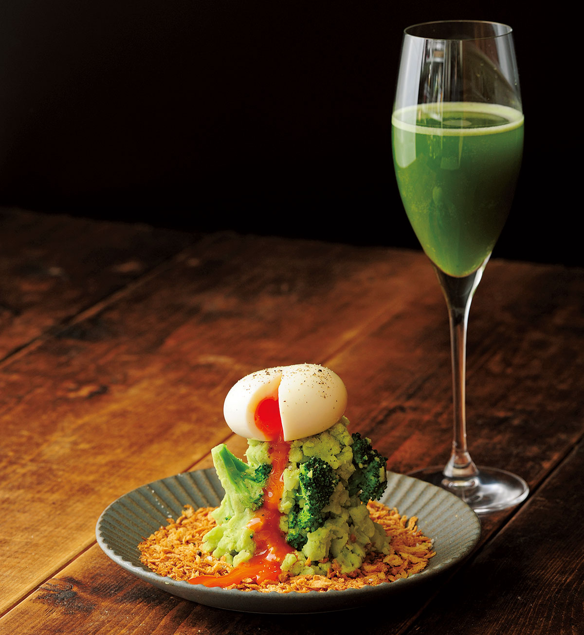 ポテトサラダに抹茶を練り込むことで、かすかに香る風味をオンし、大人の味わいを演出。土に見立てた香ばしいパン粉と半熟玉子のコクにお酒が止まらなくなる!