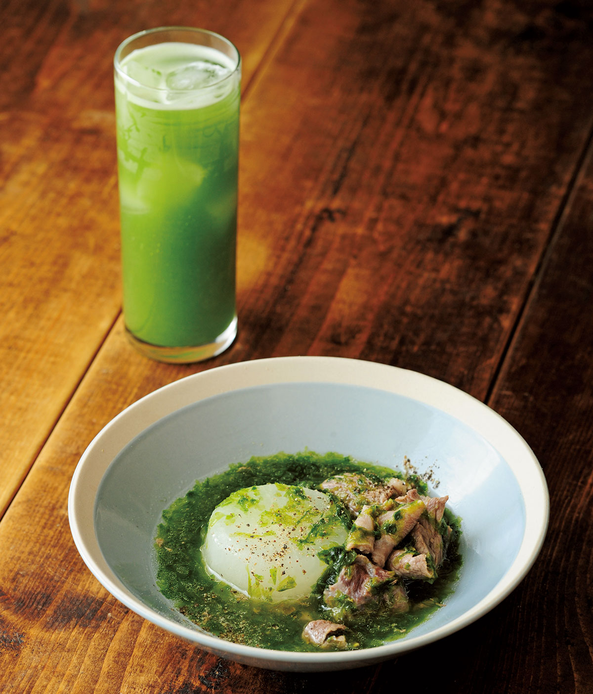 スープにカツオと牛肉のエキスが含まれた濃厚な仕上がりなので、スッキリした寶「抹茶ハイ」との相性は言わずもがな。さらに海苔から香る海藻特有の風味が、抹茶の香りと一致することで、酒と料理がスッと入ってくる。