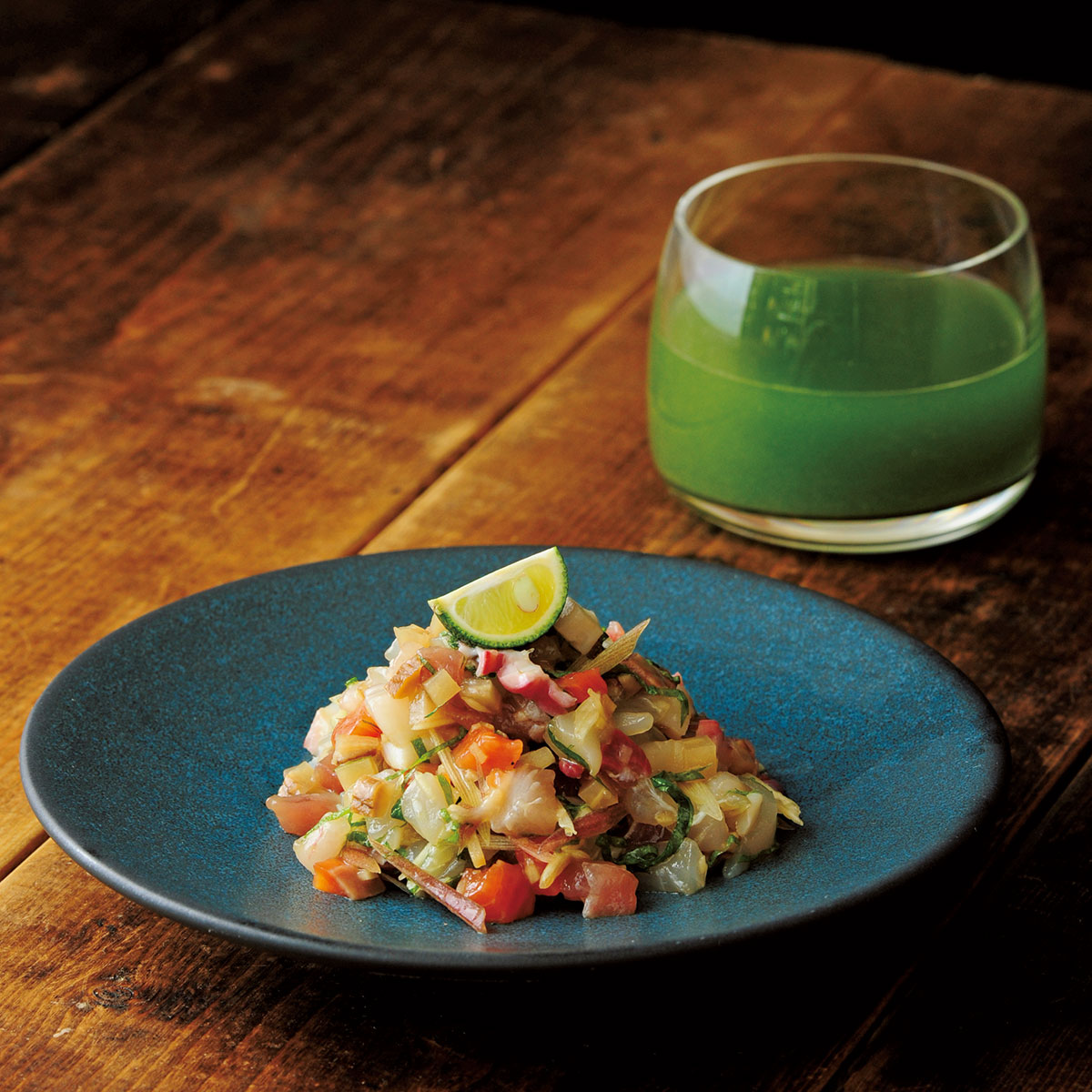 軟らかく煮込んだ牛すじを柚子コショウで爽やかに。動物性の風味に磯の香りが意外にも好相性で、 身体もぽかぽか温まるおつまみに。