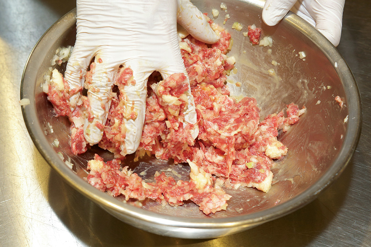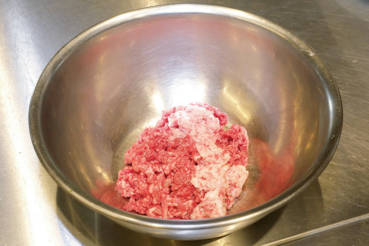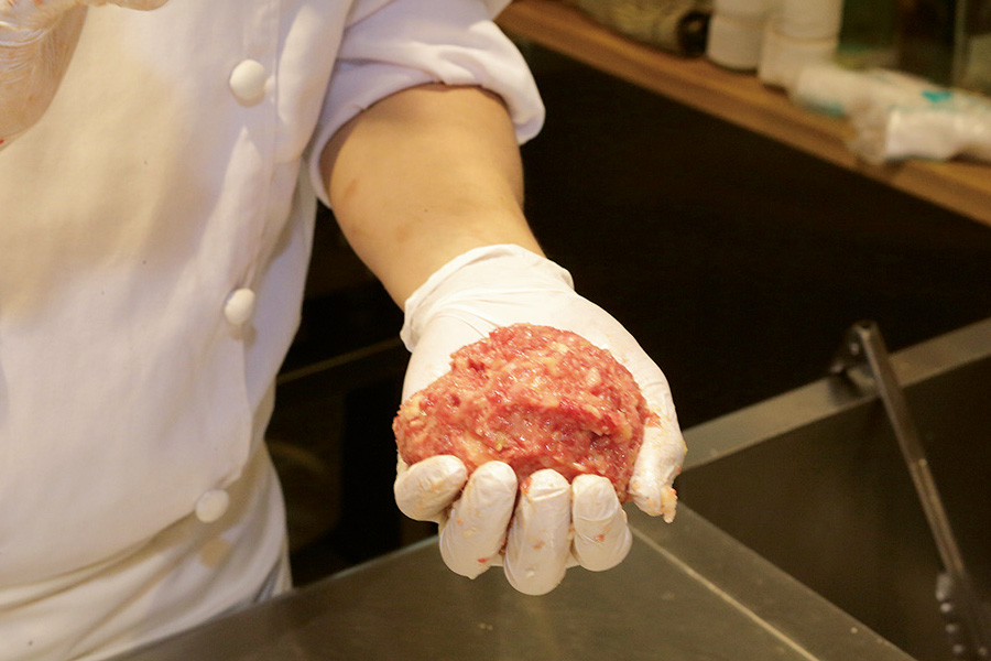 牛脂をふんだんに使うのが、やわらかいハンバーグの秘訣。用賀倶楽部では全体量に対し、20%にあたる量の良質な和牛の牛脂を使っている。