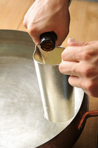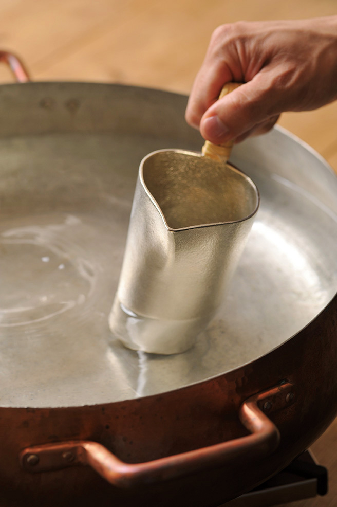 ゆっくり加熱する時の安定性と熱伝導率の良さから、店では銅鍋と錫のチロリを使用。チロリをゆっくり揺らすことで、酒の空気に触れる部分を変え、香りや味わいを均等にする。