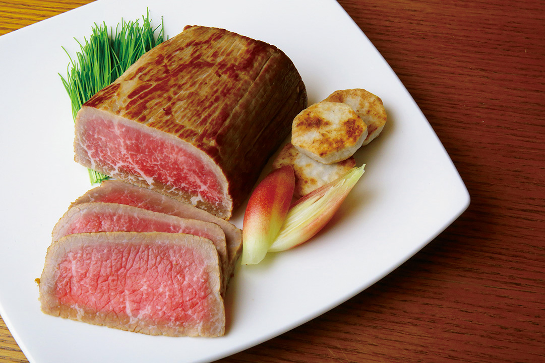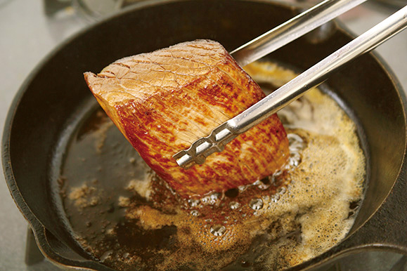 自宅でも簡単に作れる牛肉のタタキ。肉はなるべく直方体に近い形の良い塊を選び、一面ずつ丁寧にじっくりと焼くことで肉汁を充分に閉じ込めジューシーな仕上がりとなる。香り付けのバター、冷やしの行程は丁寧に行ないたい。