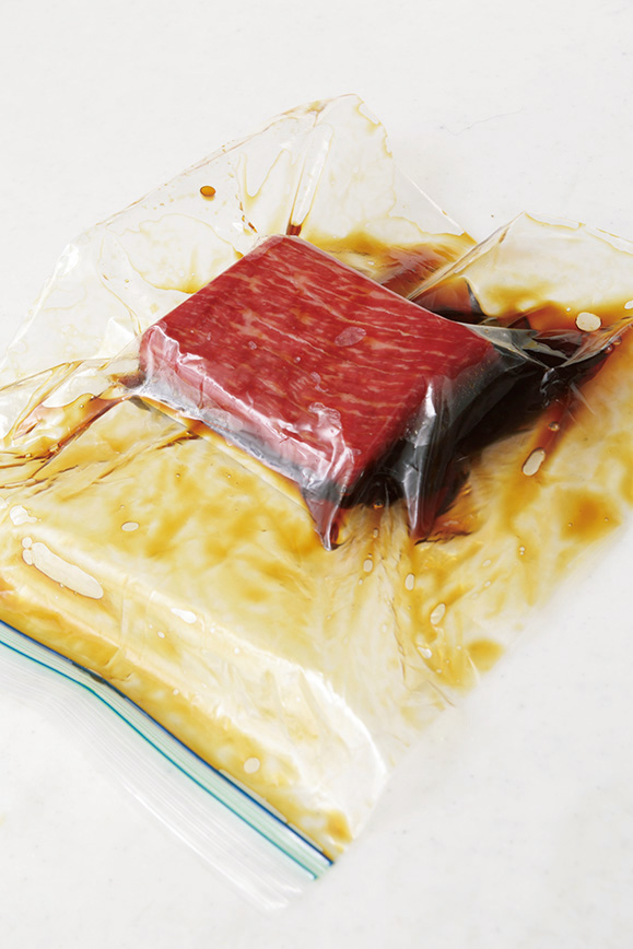 1 肉を漬け込みダレとともにビニール袋に入れ、空気を抜き冷蔵庫で1日ほど寝かす。