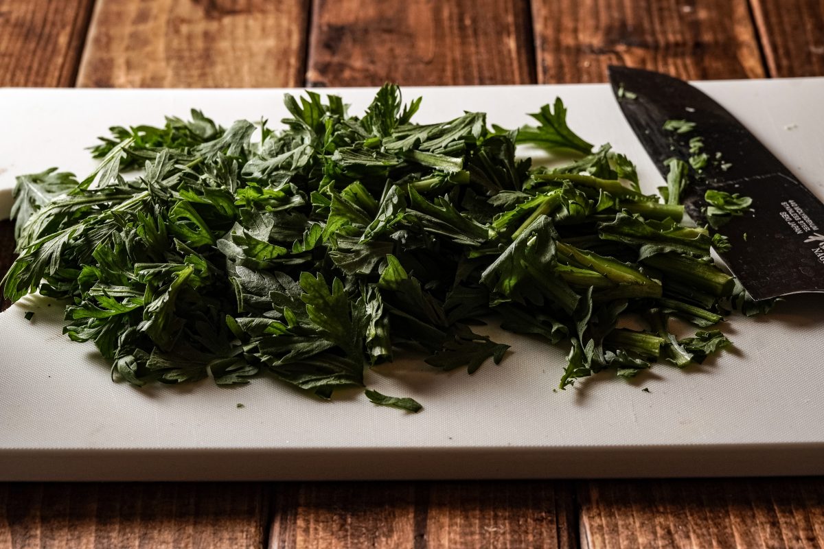 1 春菊は根本の硬い部分を落とし、ブレンダーにかけやすいようにざっくり切っておく。