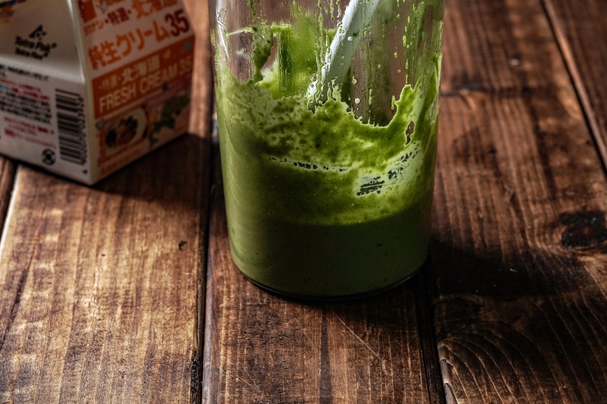 2 1の春菊とオリーブオイル、酢、塩を合わせてブレンダーで液状になるまで撹拌する。