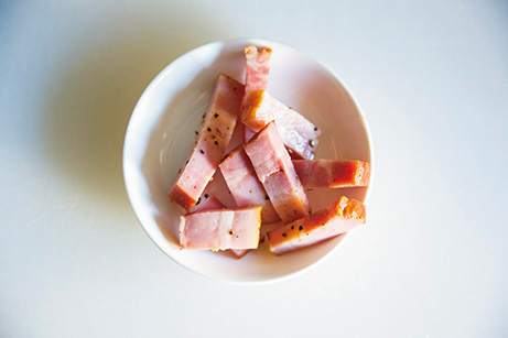 1 ベーコンを1cm角に切り、少量のオリーブ油と黒胡椒(ともに分量外)で軽く炒める。