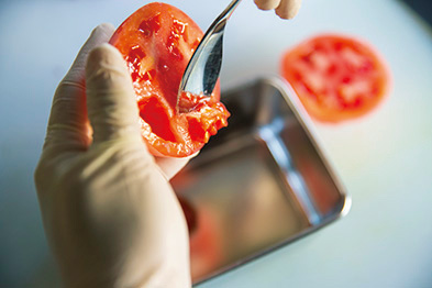 2 トマトを半分に切り、水っぽくならないように種の部分を取り除き、1cm角に切る。