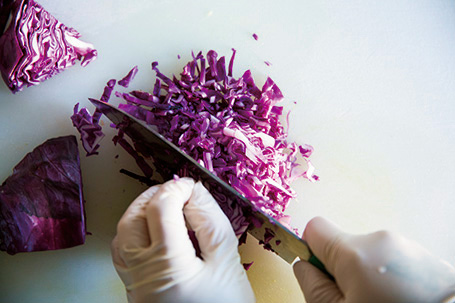 5 紫キャベツをみじん切りにする。大豆の水気を切っておく。