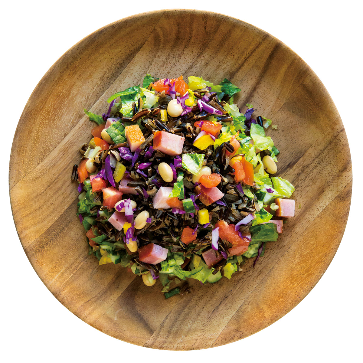 ネイティブ・アメリカンが好んだ高タンパクなワイルドライスをメインに、紫キャベツやパプリカ、トマトの彩りがポイント。スーパーフードと彩り野菜をスパイシーにまとめて。