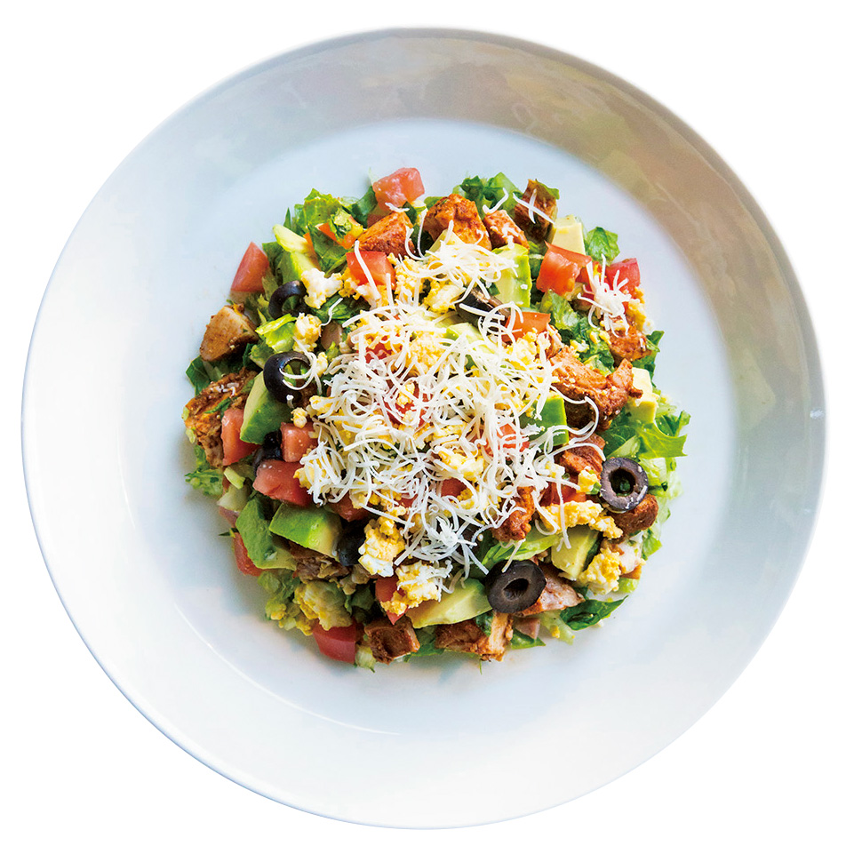 スパイスでマリネし、1日漬け込んで焼いた鶏もも肉、種を取り除いたトマト、アボカドをダイスカットし、茹で卵はみじん切り、オリーブは輪切りにする。ロメインレタスとベーコンをチョップし、材料を器に盛り付け、チーズを削りかける。