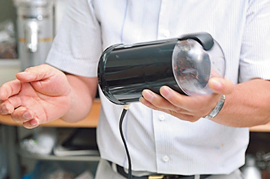 小さな電動ミルは摩擦熱による豆の劣化が悩み。回転させた5秒後にスイッチオフして、本体ごとシェイク。これを5〜6回ほど繰り返すと良い。熱を防ぐと同時に、挽きムラの減少も見込めるのだ。