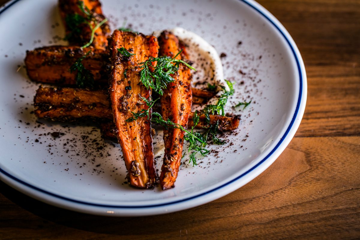 米澤流ヴィーガン料理のテクニックを結集した「キャロットのグリル」。ニンジンの甘みをじっくりと最大限に引き出し、ヴィネガーの酸味とスパイスを利かせた唯一無二の味わい。