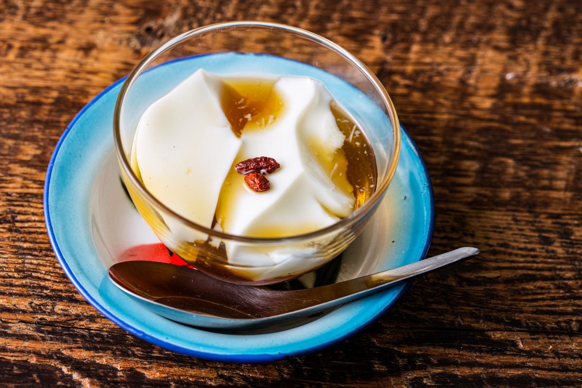 高地栽培するからこその上品な香りを楽しめる高山茶と、特有の風味とまろやかな甘みが持ち味のきび砂糖を使ってシロップを作った「台湾茶シロップの杏仁豆腐(400円)」。豆花のような味を目指したのだという。