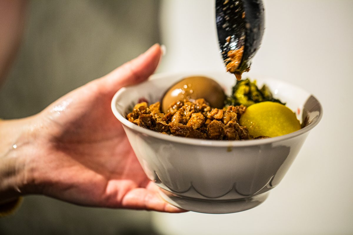 台湾で様々な魯肉飯を食べ歩いた唐澤さんが目指す味は、一番最初に食べて感動した台北の『金峰魯肉飯』だと言うが、ひと口食べてみると、現地の味を再現しつつも、脂のしつこさを抑え赤身の旨味を強く出した仕上がりにブラッシュアップされていて、しっかり“ここ”の魯肉飯になっている。ちなみに、僕は「甘じょっぱい」という表現が嫌いで基本的に「甘辛い」という言葉を使うのですが、現地の魯肉飯に限って言えば「甘じょっぱい」なんですよ。そして、帆帆魯肉飯はその微妙なニュアンスをきちんと再現している。コレ本当に日本では初めての経験。