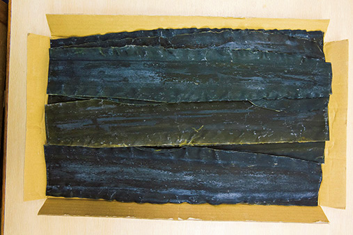 28分後に取り出し、流水で軽く流す。水で締めると少し縮む。表面はつるつる、中は何層にもなった凸凹の断面に。
