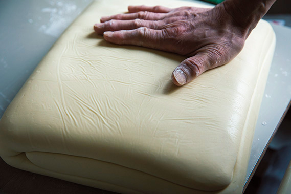 空気を残しながら、踏んで畳んでのばす工程だ。踏みすぎないことがポイント。