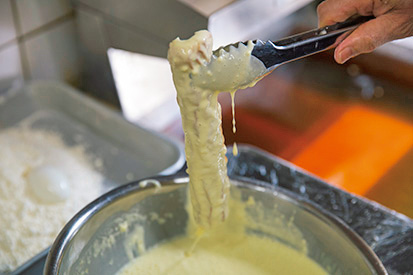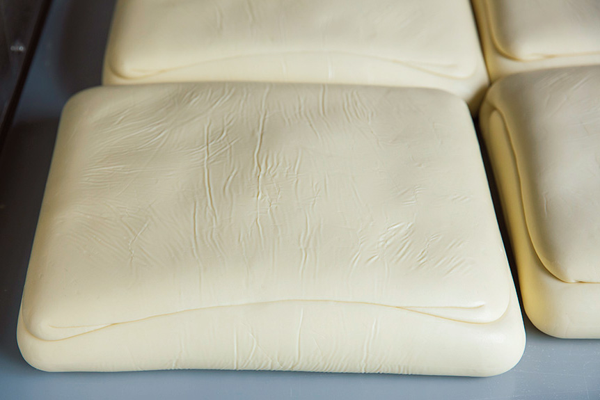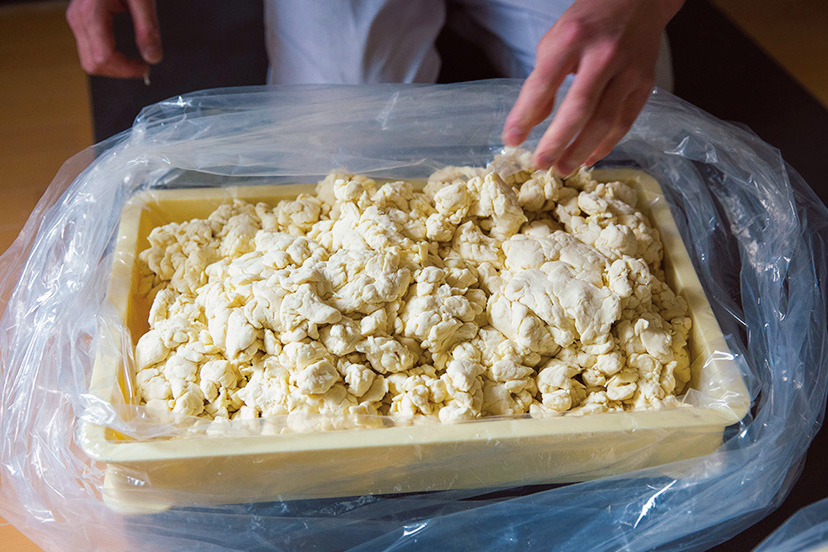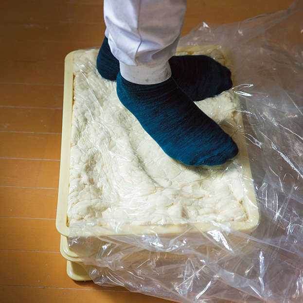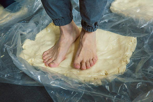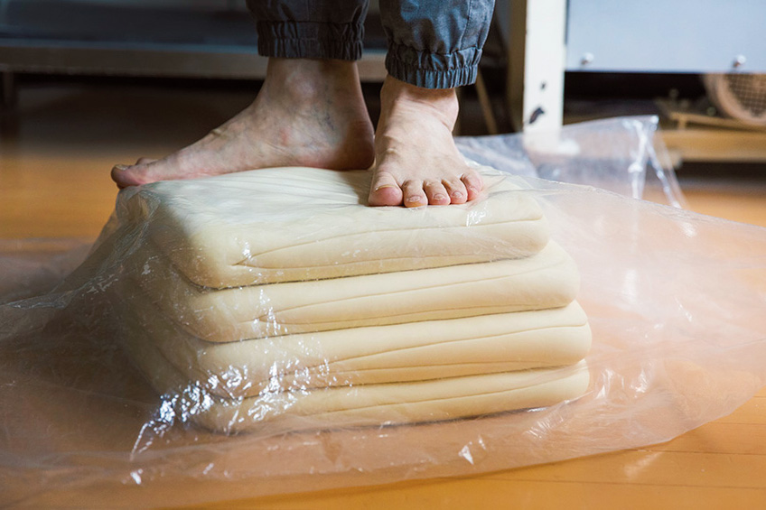 空気を残しながら、踏んで畳んでのばす工程だ。踏みすぎないことがポイント。
