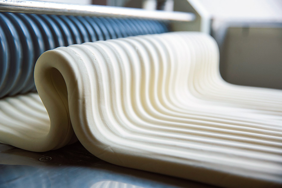 波型ローラーで粗のばしする。「波型にすると圧力が逃げるので密度が詰まり過ぎないんです」。