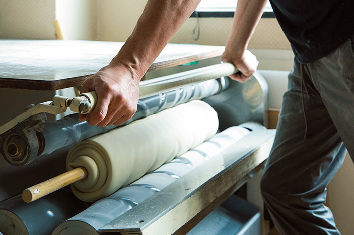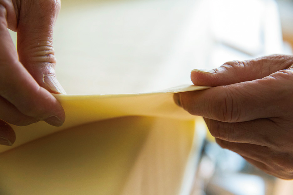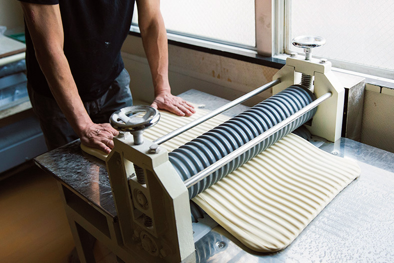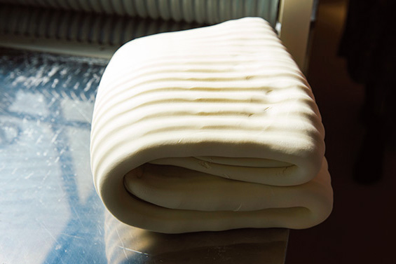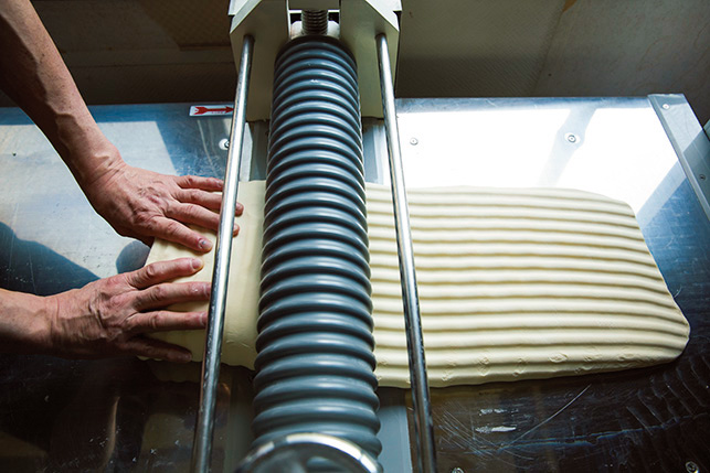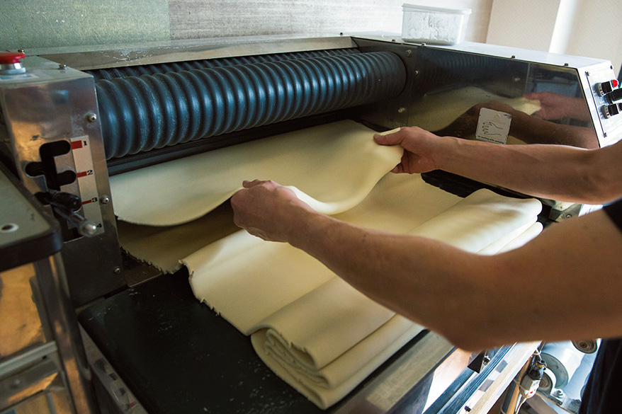 3つ折に畳んだ生地を6回に渡って踏み、機械を使ってのばす作業を繰り返す。6回は効率と味わいを追い求めて辿り着いた回数。