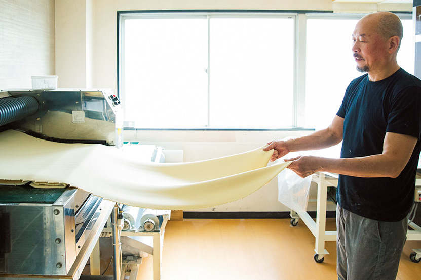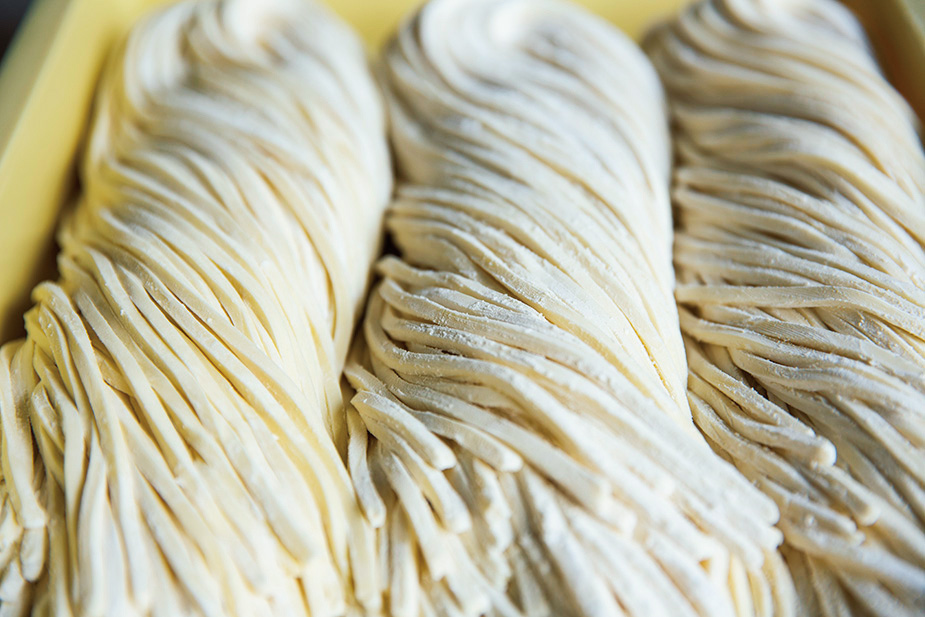 生地を何度も折ってのばすのは、グルテンを成長させてコシのある麺に仕上げるため。熟成させることでグルテンと生地が一体化し、さらに弾力が増す。熟成前後の麺を食べ比べると、熟成前はコシがなく、粉っぽいのがわかるはずだ。