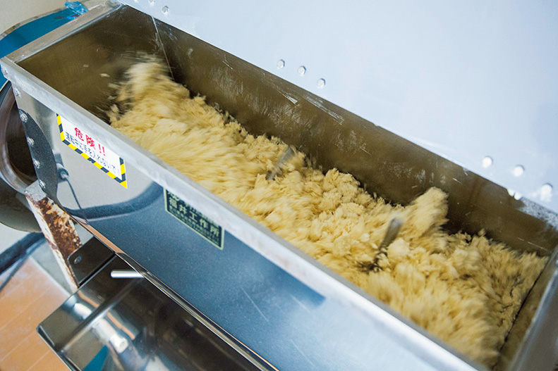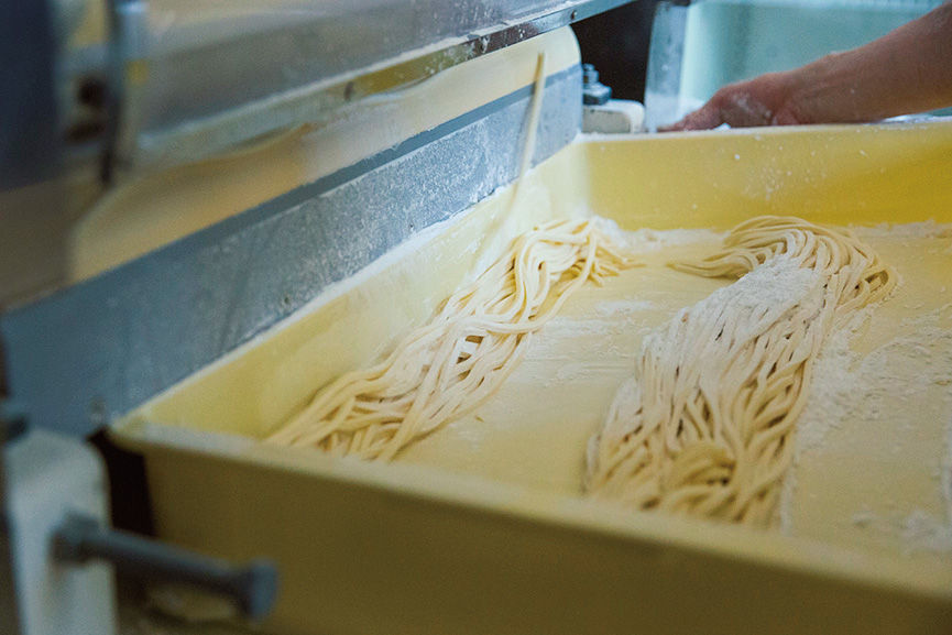 小麦粉は2種を配合し、塩はにがり成分を含む瀬戸内の海塩を使用。現在、木田氏が選んでいる粉は、オーストラリア産の製麺用粉「ASW」をベースに、北海道産小麦粉をわずかにブレンドし風味をプラス。一晩寝かせて水分を均一化させ、踏んで縦に、製麺機で横に圧力をかけてのばすことでもちもち感が出る。