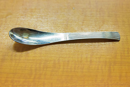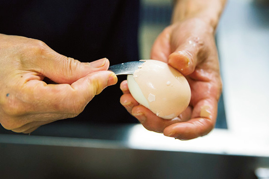 使う道具は曲線がなだらかなスプーン。まず半熟卵の上下を割り、下(曲線が緩やかな方)から白身と膜の間にスプーンを滑り込ませるように入れる。卵の上に向かって殻をめくったら、卵を横方向に回しながら残りの殻をすべてむく。