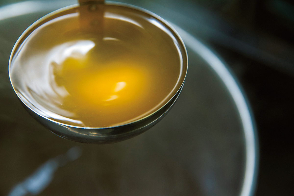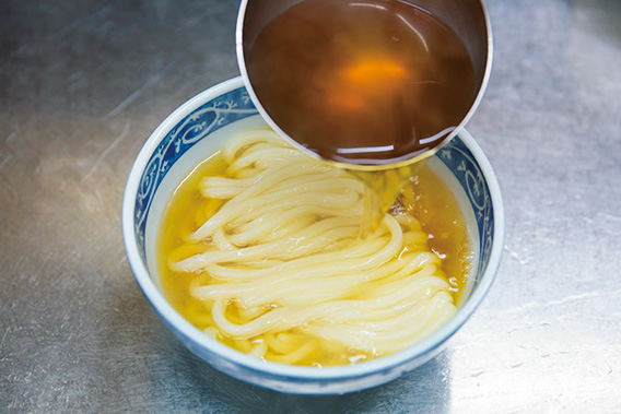 かけ用のかえしには関西で馴染み深い薄口醤油を使用し、出汁と合わせて約1時間寝かせたものを使用。透き通った琥珀色のつゆは、飲み干せる味わいに仕立てている。