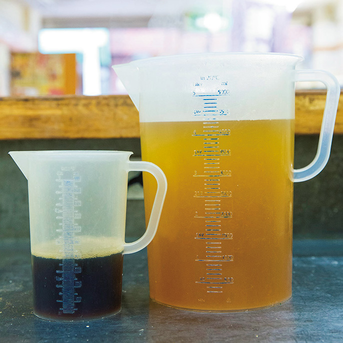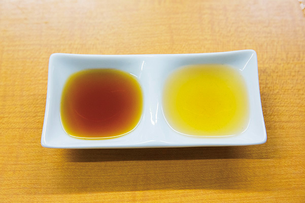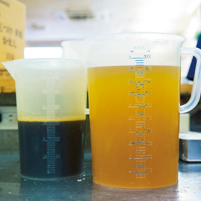 極太麺に負けないように一般的なつゆより少し濃い目に仕立てたつゆは、ぶっかけ用(左)とかけ用で濃度がまったく異なる。