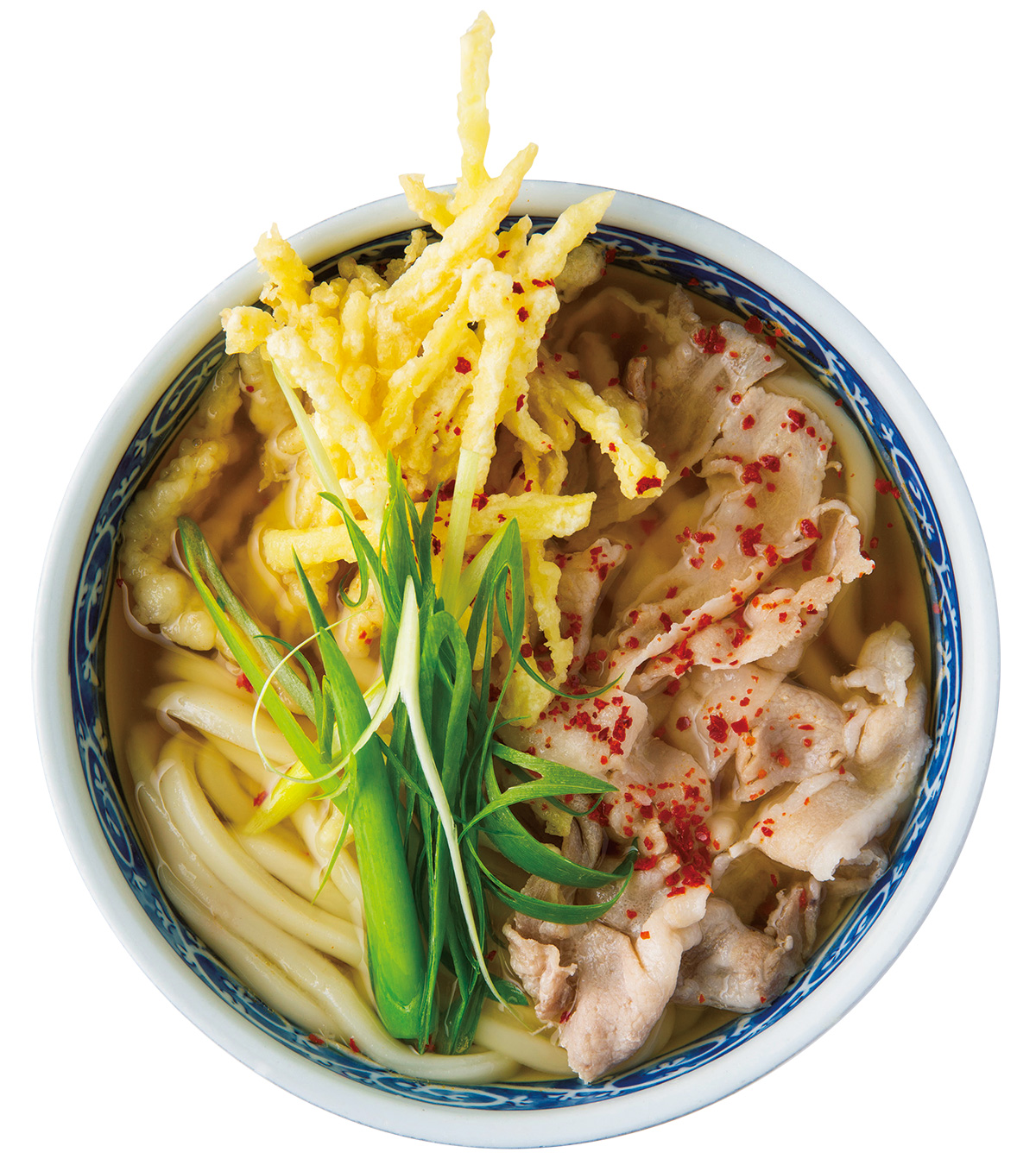 4 茹で上がったうどんを丼に入れ、かけ汁をかける。天ぷら、豚肉、青ネギを盛り付け、中挽き韓国唐辛子を振って完成。