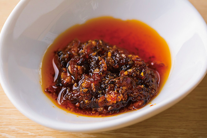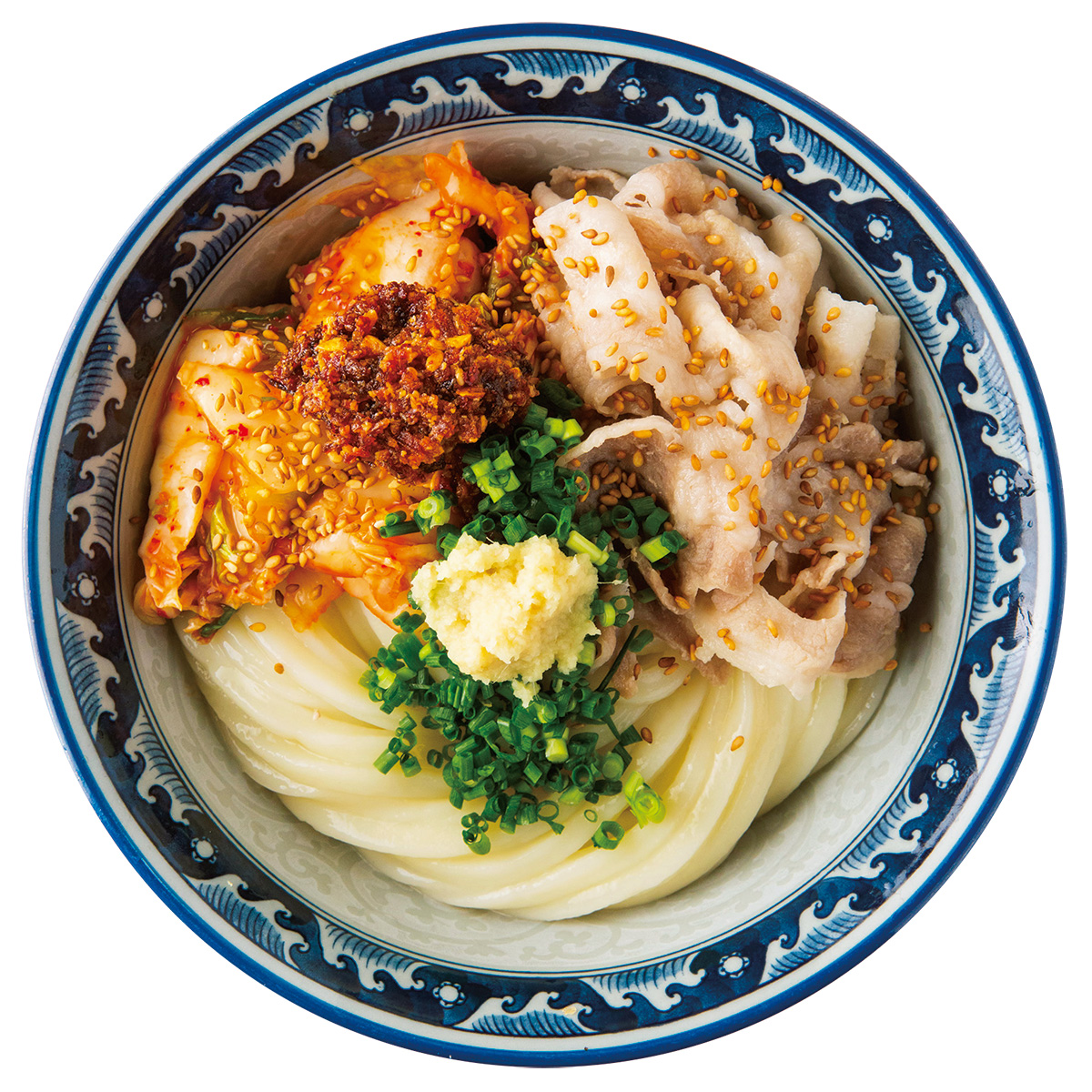 2 茹でて冷水で締めたうどんを丼に盛り、1の豚肉、キムチを盛り付ける。固形状のラー油をのせ、万能ネギ、おろし生姜を盛る。いりゴマをたっぷりふりかけてだし醤油とともに提供。
