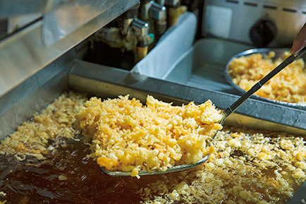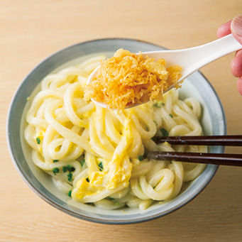 「普通の天ぷら粉を使って袋の通りの配合で作っています」と大原氏。感性だけで作る天かすが、うどんに美味しさを加える。