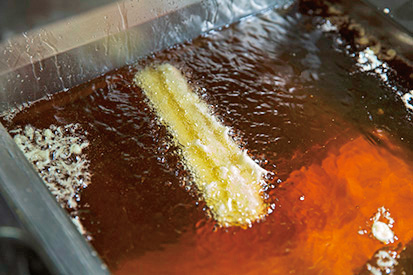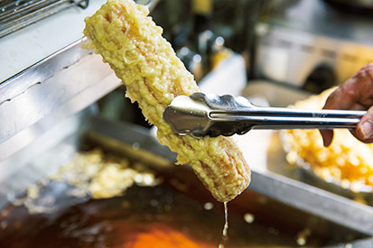 1 縦半分に切ったちくわにまんべんなく衣を絡め、中温に熱したキャノーラ油の中へ。